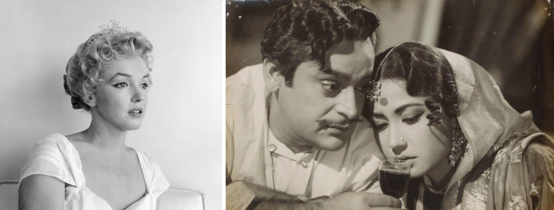 Both Marilyn Monroe and Meena Kumari became mythic emblems of tragic beauty, their on-screen personas and real-life struggles and deaths fusing into enduring cultural archetypes of sorrowful, beautiful women. Monroe’s public persona blurred vulnerability with desirability, her emotional fragility repeatedly staged as charm, even as her real-life isolation and death were absorbed into the same tragic mythology. Meena Kumari immortalised the melancholy woman as Choti Bahu, the wife of an emotionally unavailable feudal lord in (Sahib Bibi Aur Ghulam, 1962) and Nargis, the outcast courtesan who dies in a cemetery birthing her daughter, Sahibjaan (Pakeezah, 1972).